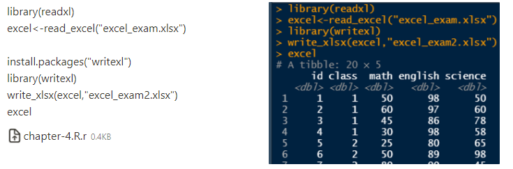 파일저장하기 (엑셀): write_xlsx(데이터, ”파일명. xlsx”)