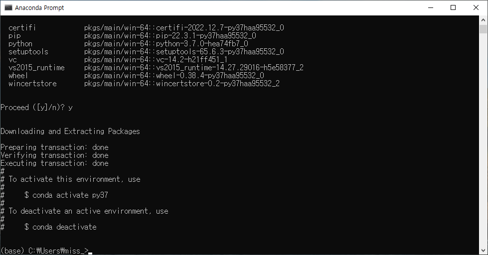 그럼 (base)로 시작하였던 위치가 (py37)로 변경됩니다.