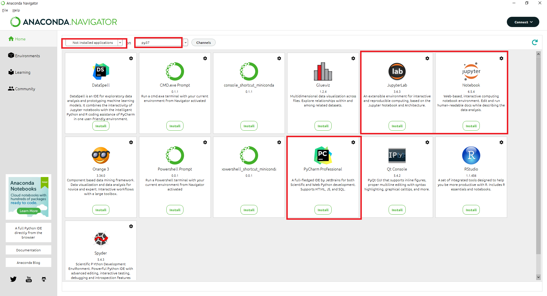 home탭에서 Not installed applications (설치가 안된 어플리케이션) py37 (내 가상환경) 을 선택하고