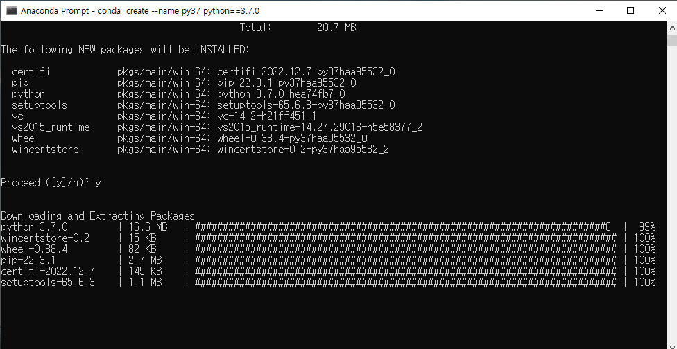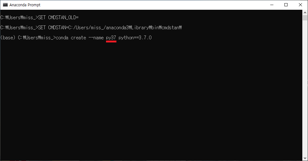 - 파이썬 3.7.0이기에 외우기 쉽게 가상환경명을 py37로 했습니다. 그리고 엔터!!