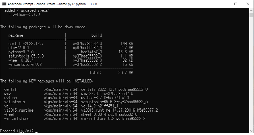 2. 명령어 입력창에 conda create --name 가상환경이름 python==3.7.0 (입맞에 맞게 버전 입력)
