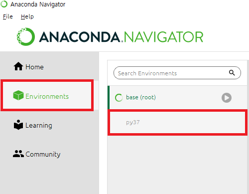 8. anconda.navigator 실행 후 Environments 에서 가상환경 설치 확인 (py37)