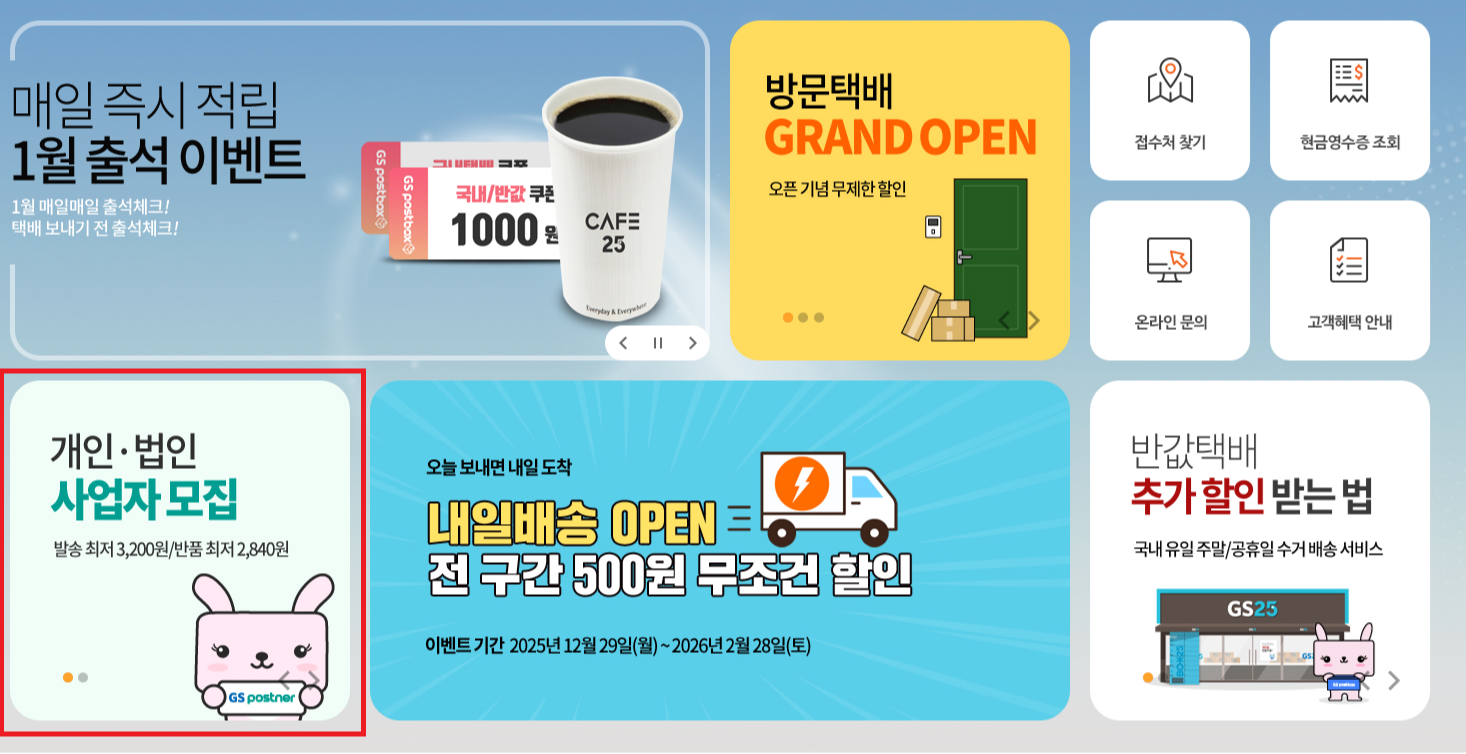 GS25 편의점 택배 홈페이지 메인에서 개인/법인 사업자 모집 배너를 누르고 들어가서