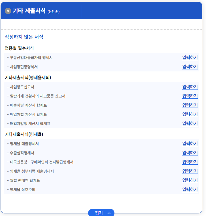 다섯 번째, 1번 매출세액 / 2번 공제 세액 / 3번 공제. 가산 세액 / 4번 기타 제출서식으로 되어있는 항목들의 입력/수정 버튼을 눌러서 해당하는 부분을 조회 및 저장