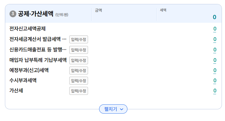3번 공제/가산세액 부분인데 이건은 간이과세자는 거의 해당 안 되는 부분 (세금계산서 발행 시 건당 200원 공제가 된다는데 간이과세자가 계산서 발행이 되는지 잘...)