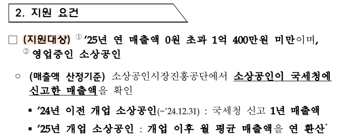 올해 (2026 경영안정 바우처): 연 매출 1억 400만 원 미만 (25만 원 지원)